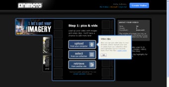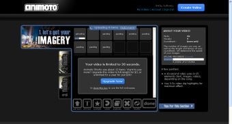 Animoto ha un'interfaccia pulita e sexy. Per poter usare l'applicazione devi registrarti gratuitamente. Puoi scegliere fra tre tipi di account, uno gratuito (Basic, video della durata massima di 30 secondi, download disabilitato), e due a pagamento (All access, con video di durata illimitata e scaricabili, e Pro, con clip di qualità DVD, video utilizzabili per uso commerciale e molti altri plus).